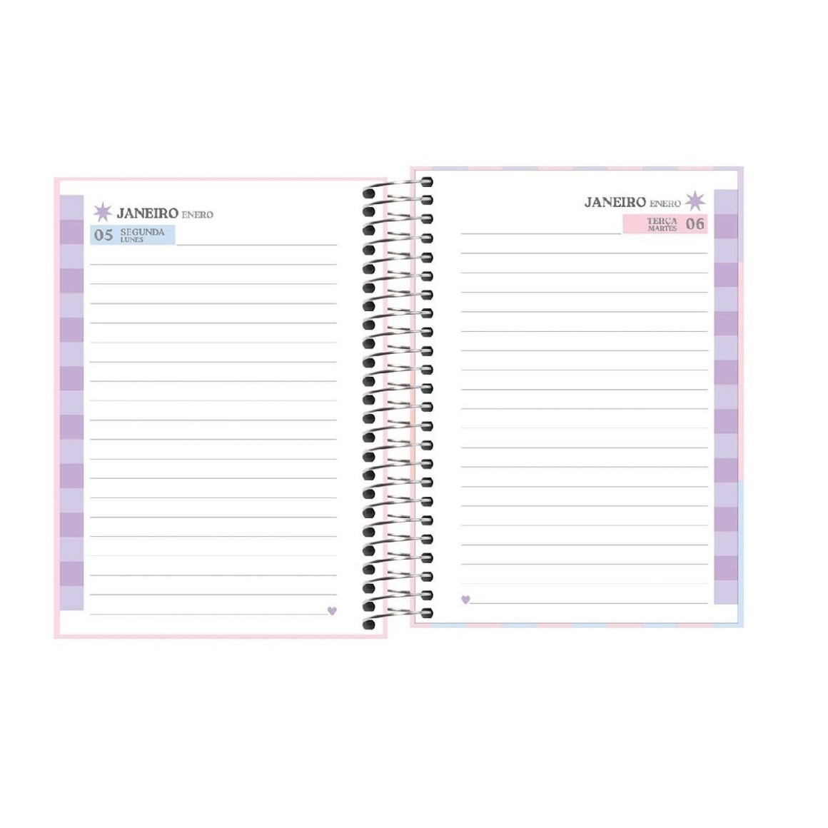 O produto tem tamanho 11,7 x 16,4 cm, capa dura com detalhes metalizados, bolsa de papel, adesivos e folhas com visão de 1 dia por página, exceto aos sábados e domingos.