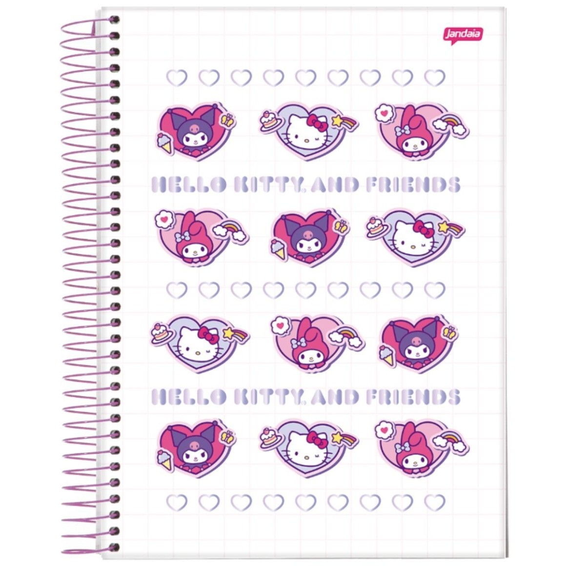 Hello Kitty, My Melody e Kuromi celebram a amizade com estilo e personalidade. Com acabamento em laminacao fosca e detalhes em Hot Stamping, as capas ganham um toque sofisticado sem perder a leveza e o encanto. A colecao traz quatro modelos vibrantes e modernos. Conta com pauta inteligente JandaIA, que ajuda a manter as anotacoes bem organizadas, alem de acessorios funcionais que completam a experiencia: Cartela de adesivos personalizada, Guarda decorado, Folha de planejamento, Etiquetas e bolsa de papel. Ideal para quem busca um caderno bonito, pratico e cheio de personalidade — perfeito para transformar a rotina de estudos com mais charme e alegria.