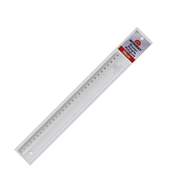 Régua em poliestireno, com escala de 30 cm gravada por transferência de imagem, garantindo alta precisão.
