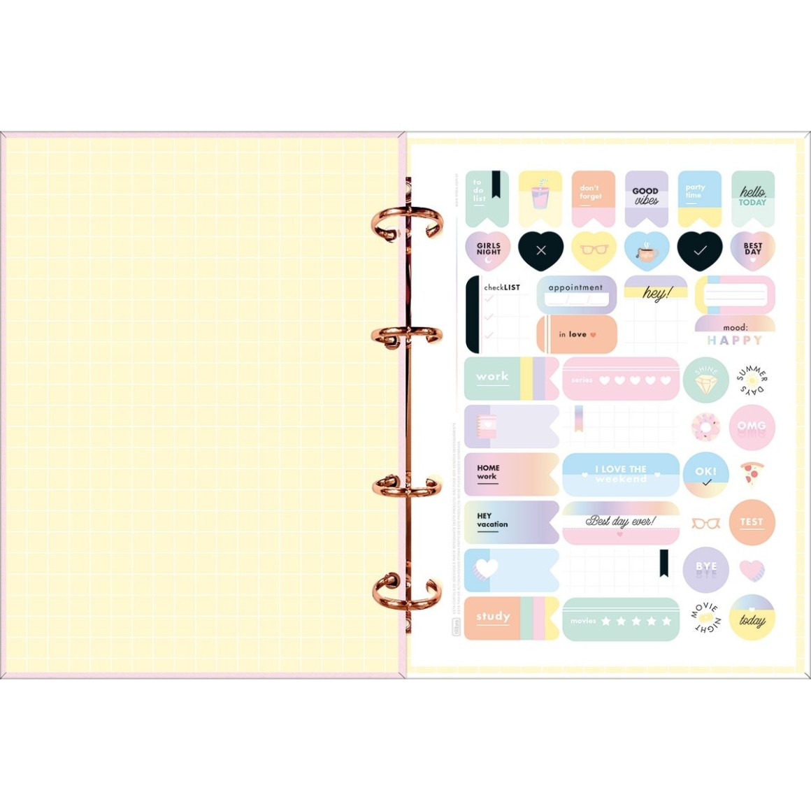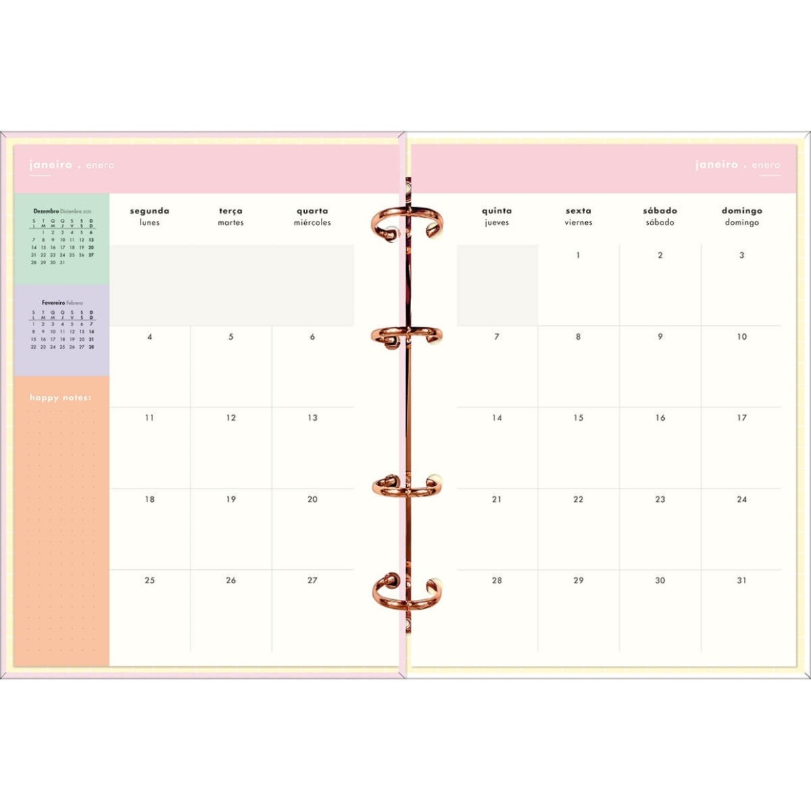 O Planner Argolado Capa Dura Happy Rosa 2021 pode ser usado para organizar os compromissos do dia a dia, em casa, no trabalho e na escola. Com formato compacto, leve e bastante funcional, tem capa dura com detalhe metalizado, folha de adesivos, 12 divisórias e bolsa plástica.