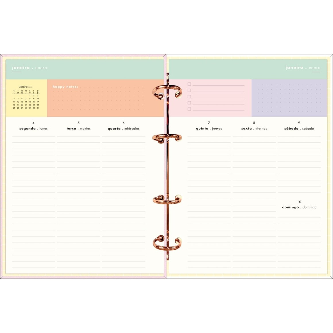 O miolo deste produto conta com 80 folhas em papel creme, com visões anual, mensal e semanal, além de páginas para anotações.