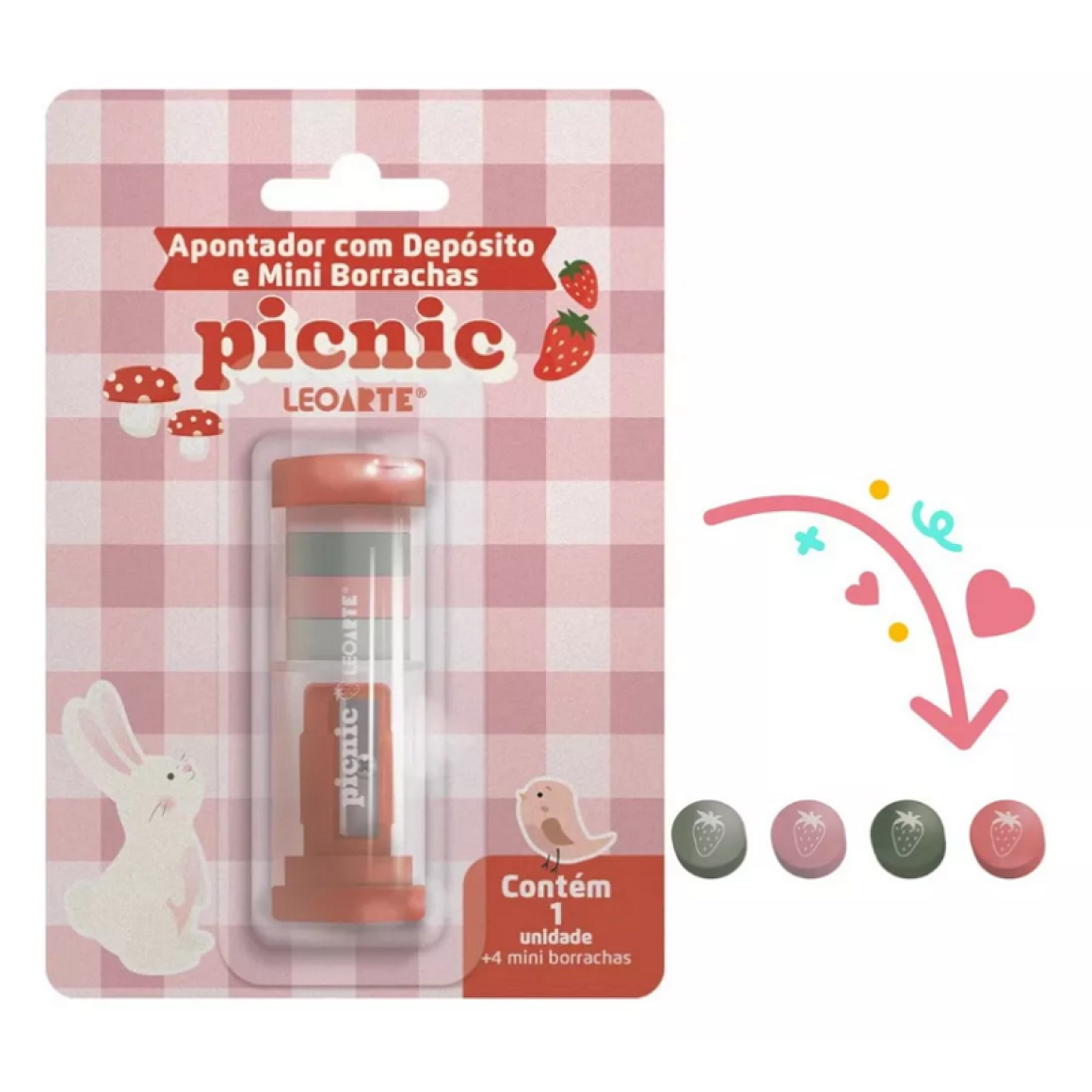 2. APONTADOR COM DEPÓSITO E 4 MINI BORRACHAS PICNIC LEOARTE