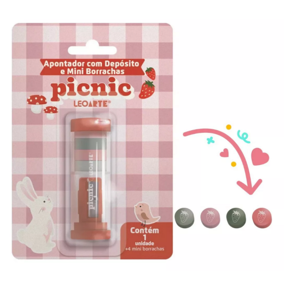 APONTADOR COM DEPÓSITO E 4 MINI BORRACHAS PICNIC LEOARTE