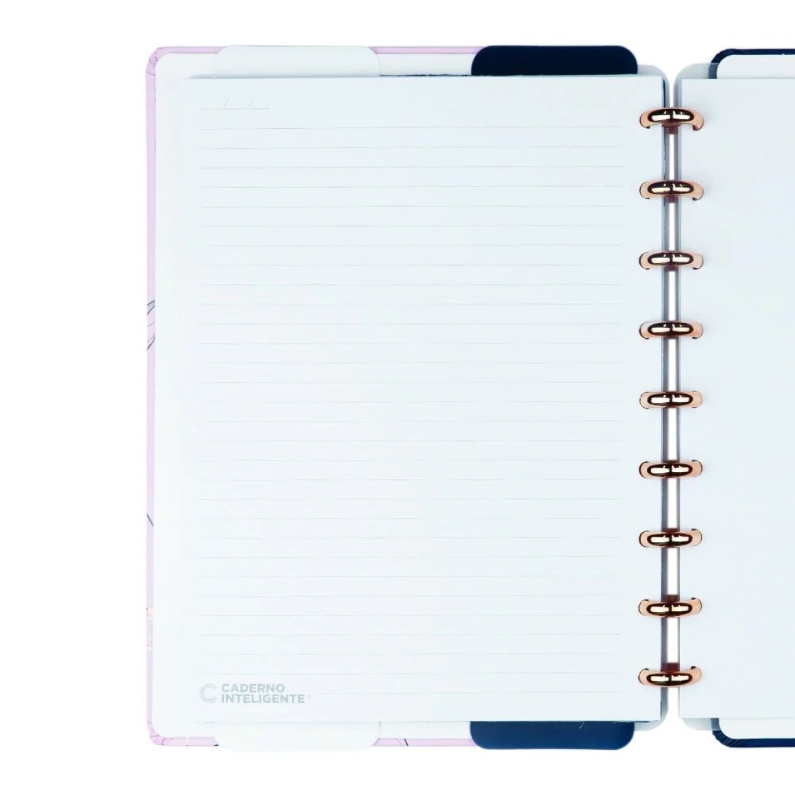 O caderno possui capa e contracapa rígidas, 01 folha de adesivos, 01 bolsa plástica, 01 folha de face chart, 01 folha de instruções de uso e manuseio, além de refis e acessórios da marca no verso. Conta ainda com 01 folha de identificação com calendário no verso, 04 divisórias com abas para identificação (02 azuis marinho e 02 brancas), 80 folhas offset 90g (60 folhas pautadas e 20 folhas lisas brancas para você imprimir e voltar ao Caderno Inteligente) e 01 suporte com elástico para 01 caneta ou 01 lápis.