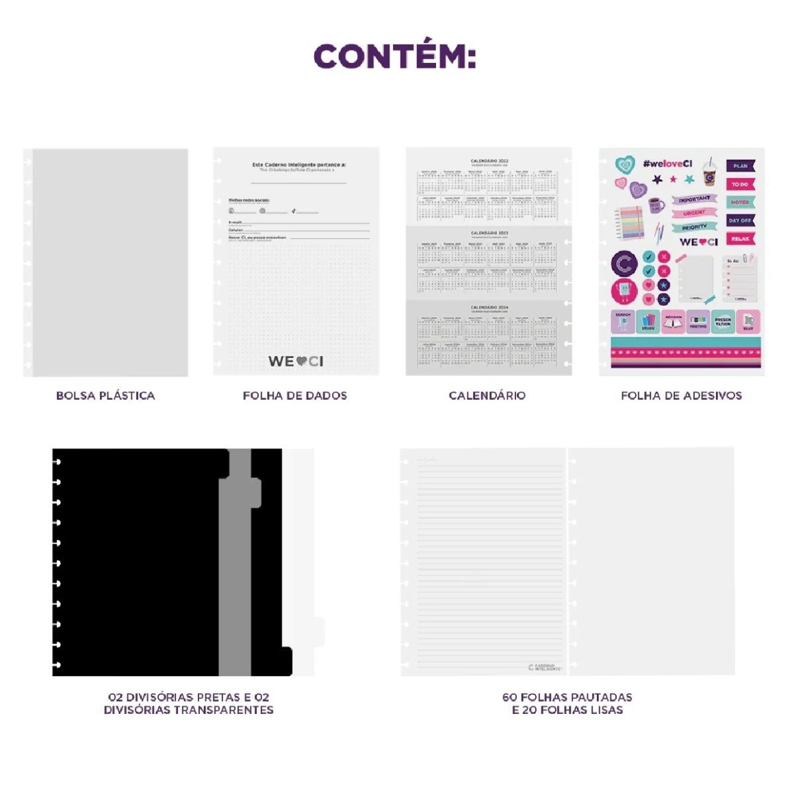 Capa e contracapa rígidas, 01 folha de adesivos, 01 folha de instrução de uso e manuseio, com refis e acessórios da marca disponíveis no verso, 01 folha de identificação com calendário no verso, 50 folhas Lisas Offset 120g e 01 suporte com elástico para 01 caneta ou 01 lápis.