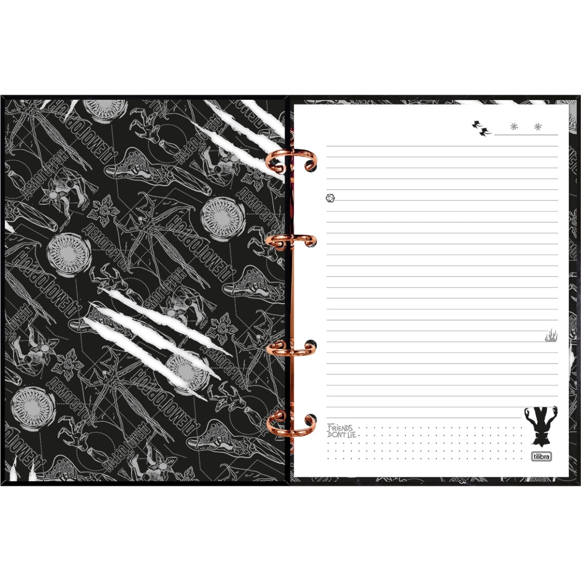 O Caderno Argolado Cartonado Colegial Stranger Things 160 Folhas possui formato compacto, é leve e bastante funcional. Vem com capa dura com detalhe metalizado e parte interna decorada, divisórias, folha adesiva, folhas pautadas e bolsa plástica para guardar trabalhos e anotações.