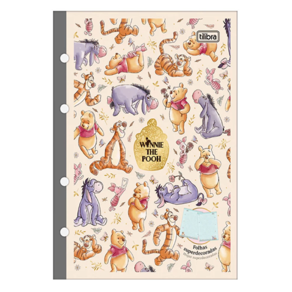 O Refil Tiliflex para Caderno Argolado Colegial Pooh 80 Folhas possui folha com adesivos funcionais e folhas pautadas decoradas coladas. Ideal para o dia a dia na escola ou na faculdade.