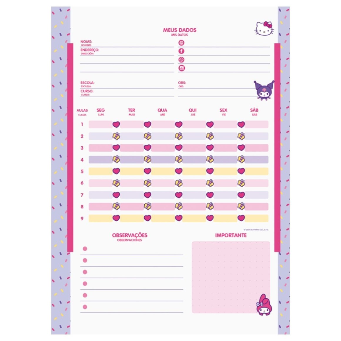 Hello Kitty, My Melody e Kuromi celebram a amizade com estilo e personalidade. Com acabamento em laminacao fosca e detalhes em Hot Stamping, as capas ganham um toque sofisticado sem perder a leveza e o encanto. A colecao traz quatro modelos vibrantes e modernos. Conta com pauta inteligente JandaIA, que ajuda a manter as anotacoes bem organizadas, alem de acessorios funcionais que completam a experiencia: Cartela de adesivos personalizada, Guarda decorado, Folha de planejamento, Etiquetas e bolsa de papel. Ideal para quem busca um caderno bonito, pratico e cheio de personalidade — perfeito para transformar a rotina de estudos com mais charme e alegria.