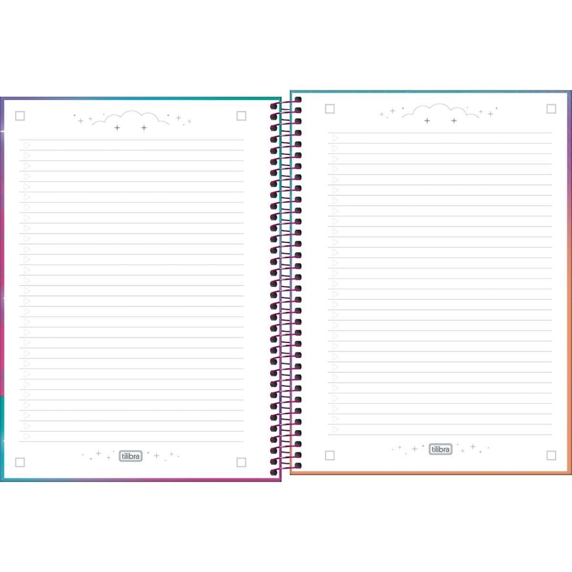 Use este modelo, com capa dura com a parte interna decorada, bolsa de papel para guardar trabalhos, adesivos funcionais, folhas pautadas e espiral colorido, para anotar as aulas, fazer resumos, listar tarefas e organizar as ideias de forma prática e eficiente.