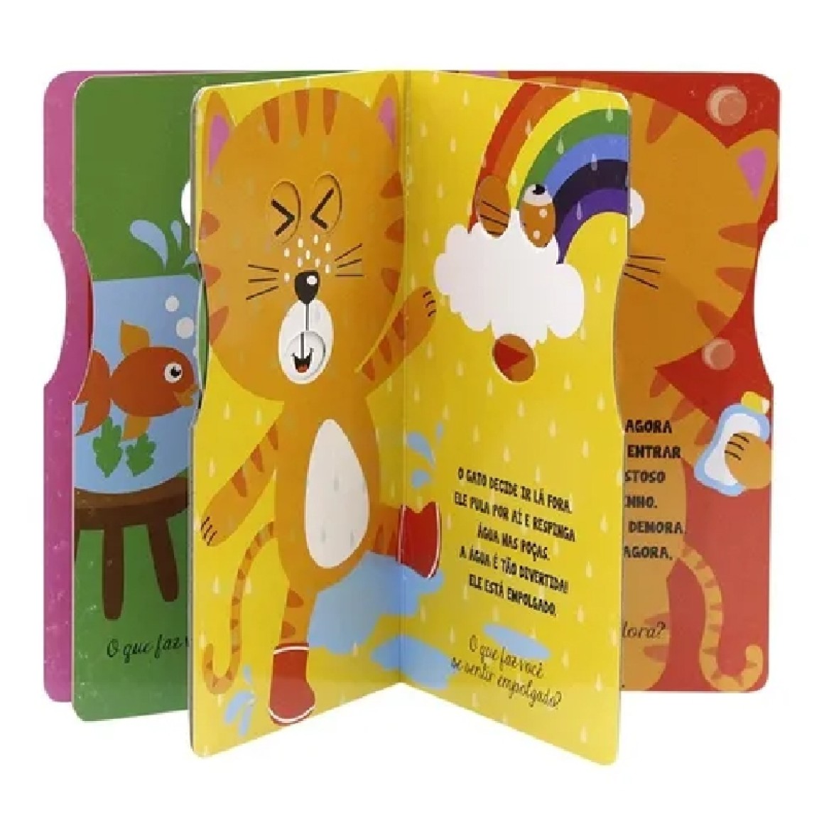 Hoje está chovendo. O gato não gosta de água. Gire o disco para ver o que o gato está sentindo. Você consegue demonstrar os seus sentimentos também?