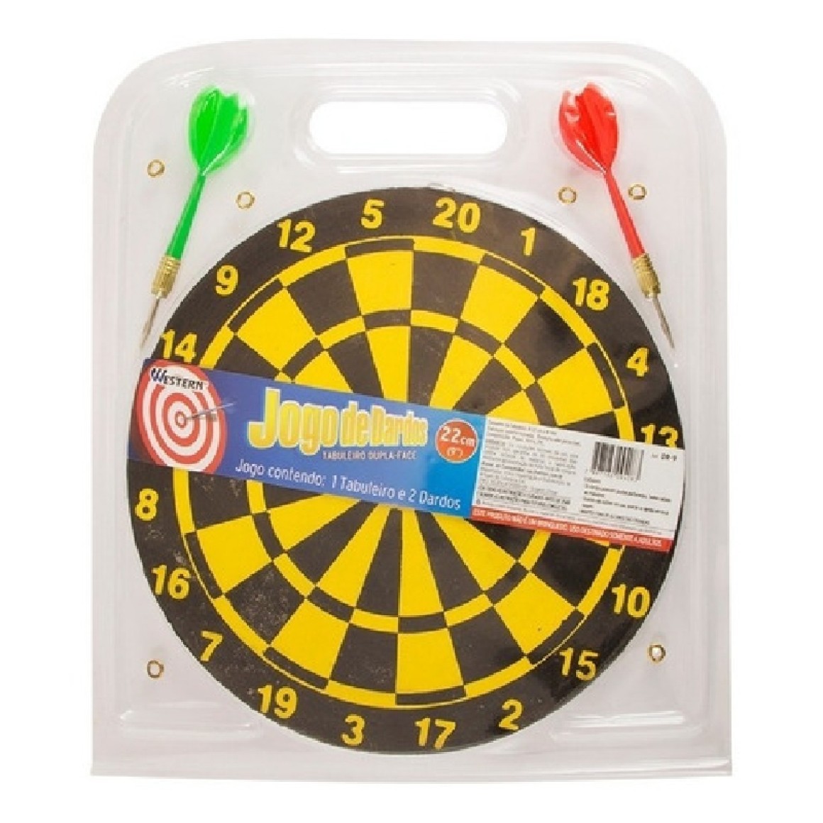 - Cor: Tabuleiro preto com amarelo, 1 dardo verde e 1 vermelho.