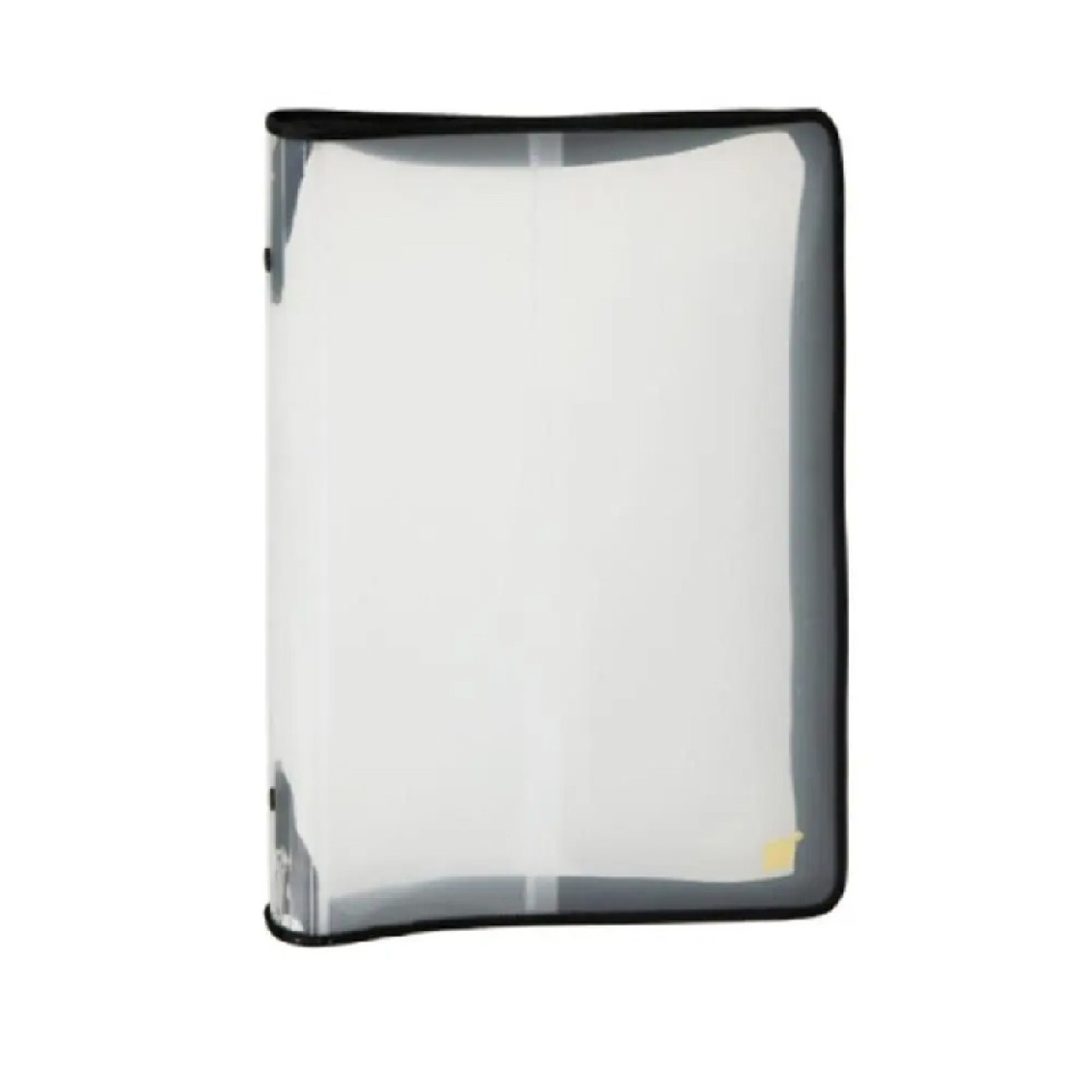 Pasta com zíper ofício transparente. Possui bolso interno na contracapa e borda reforçada em tecido colorido. Medidas: 340x260x45mm.